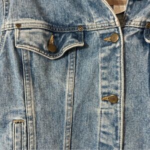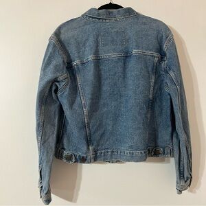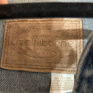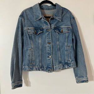 Very unique denim jacket by Liz Claiborne. The hem of the jacket curves like the bottom of a corset. The denim is thick and rigid, not soft and floppy. So it keeps its shape during wear. Size Large.