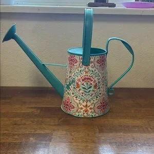 Charming floral watering can with teal accents. Perfect for garden enthusiasts. Holds just over half gallon of water.