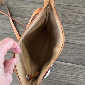 Campo dei Fiori pastel floral lambskin leather crossbody trimmed in tan leather with adjustable strap. Made in Italy and reminiscent of Patricia Nash. Zip closure. One pleated outer pocket is not lined so you can feel the softness of the leather. Inside is lined and has one zip pocket. No stains, cracks or rips but back corner has faded where rubbing against the body. Not seen while carrying. Strap drop is 21” at shortest length with two possible adjustments adding 2” each.