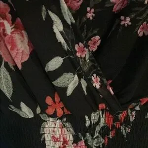 This exquisite sundress showcases a charming pink floral design on a black canvas, ideal for cocktail events. It features a flattering v-neckline and short puff sleeves.
