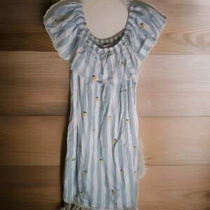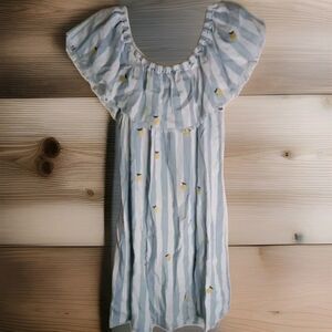 This Billy T dress is a stylish short mini dress in size S. The dress is made of lyocell material and has a blue striped pattern with embroidered pineapple accents, adding a fun and trendy touch. It is a pullover style dress that is perfect for casual outings or summer occasions, making it a fashionable choice for women looking for a unique and flattering dress option. LENGTH 28 PP 17