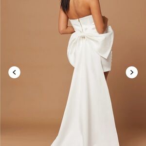 This elegant white dress features a stunning bow detail at the back, perfect for any special occasion. Its sleek design offers a sophisticated look. Great for a bride. Never worn