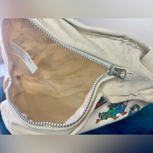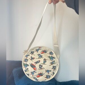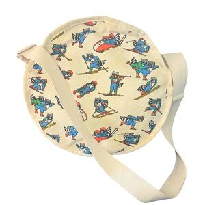 Own a piece of Olympic history! This rare, round canvas crossbody bag from the 1980 Winter Olympics in Lake Placid features Roni the Raccoon, the beloved mascot, in vibrant, whimsical scenes of skiing, bobsledding, skating, and more.