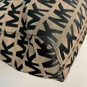Elevate your style with this stunning Michael Kors Jet Set Tote! Featuring the iconic black and tan 'MK' monogrammed canvas, complemented by luxurious gold-toned hardware, this tote is both fashionable and functional.