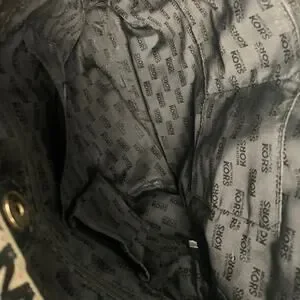 The dual adjustable shoulder straps ensure comfortable carrying, while the snap closure keeps your belongings secure. The interior, lined with black 'MICHAEL KORS' monogrammed fabric, boasts four slip pockets and one zipper pocket, offering ample organization for all your essentials.