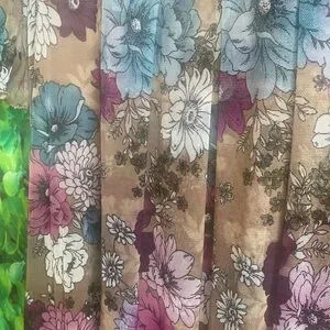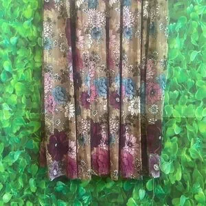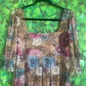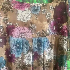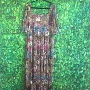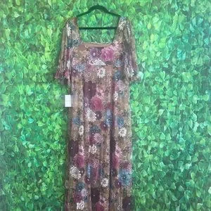 This beautiful dress features a boho floral overlay in various shades of purple, white, pink, and blue against a tan background. It’s available in a women’s size 12, brand new.