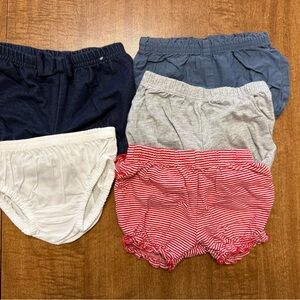 Pic 11: Carter’s white and white/red striped shorts/diaper cover. Size 3 months. Garanimals dark blue, size 0-3 months. Carter’s gray, size 6 months. Gymboree blue, size 3-6 months.