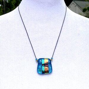 * 1pc Dichroic Fused Glass Necklace has blue, green, golden orange, purple & black colors. Approx measurements 1 1/4" length x 1 1/8" width (pendant)/ 9