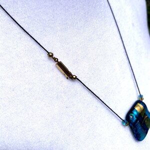 * 1pc Dichroic Fused Glass Necklace showcases blues, greens & black colors. Approx measurements 1 1/2" length x 1/2" width (pendant)/ 8 1'2" drop string necklace. Box clasp closure