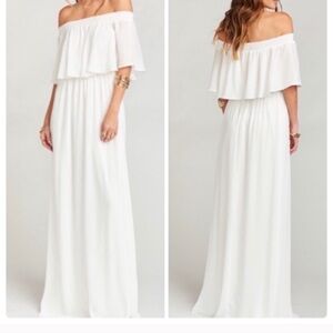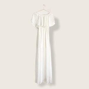 Wedding Cake Chiffon color off shoulder, ruffled top, maxi dress. In new condition with tags attached. Length is approximately 58”. See size chart for fit.
