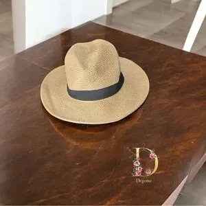 This stylish Panama hat from Banana Republic features a classic tan color with a contrasting black band, offering a timeless accessory for any wardrobe. Its medium-wide brim and rounded crown provide both elegance and sun protection, making it a perfect choice for sunny days. Crafted with attention to detail, this hat is a must-have for those seeking a blend of sophistication and functionality.