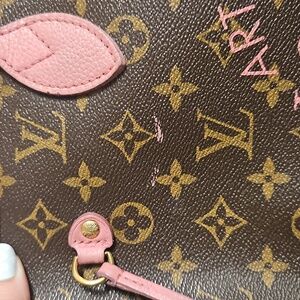 Please review all images as they are part of the description and condition of the bag. I have added a new inside pocket image to show a mark, a new back image to show some wearing on the Monogram, and a new front image to show where the pink paint of the straps had transfer.