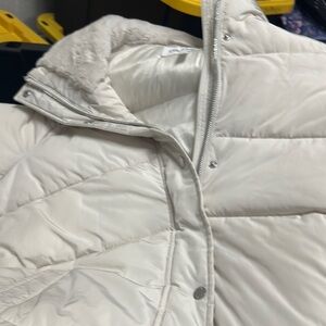 Embrace the cold with this Calvin Klein white puffer jacket, featuring a high collar and a sleek, minimalist design. The horizontal quilted sections provide a classic puffer look while ensuring warmth and comfort. Its modern silhouette makes it a versatile addition to any winter wardrobe.
