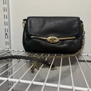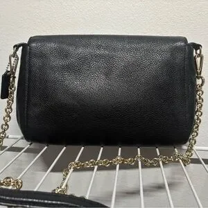 This Coach crossbody bag combines timeless elegance with modern functionality, featuring a sleek black leather design accented by gold-tone hardware. The structured silhouette and chain strap offer versatile styling options, making it a perfect choice for both casual outings and sophisticated events.