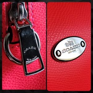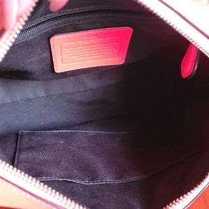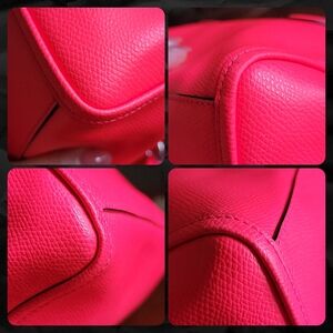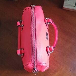 Coach Mini Bennet Satchel Neon Pink Crossgrain Leather 2-way Bag is Coach style number F34697, made in 2014. The exterior is made of neon pink crossgrain leather in a barrel style satchel, with dual rolled handles and a removable crossbody/shoulder strap. Silver-tone hardware. Top-zip closure with Coach branded zipper pull. The interior is black canvas and has 1 slip pocket and 1 zipper pocket with leather zipper pull.