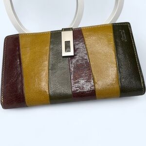 Stylish and functional, this Mundi leather wallet features a striking patchwork design in earthy tones—olive green, mustard, burgundy, and brown. The trifold layout offers plenty of space for cards, cash, and coins with a secure snap closure. A perfect everyday wallet with a vintage flair!