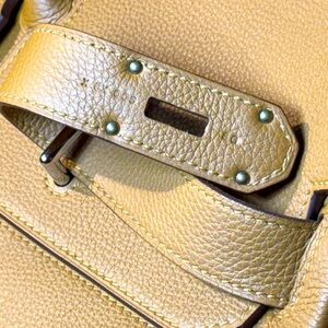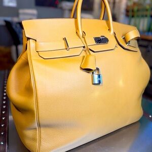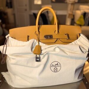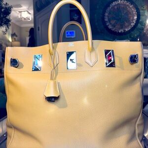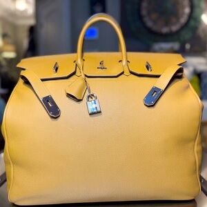 Experience the epitome of sophistication with this Hermes tan leather travel bag. Crafted with precision, it features a structured design and a luxurious texture, making it an ideal choice for those who like to travel in the highest style.