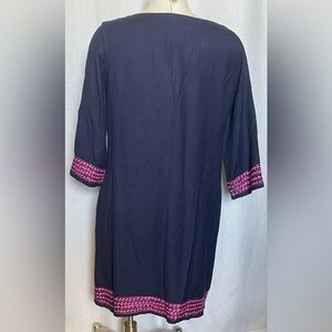Navy blue with bright pink embroidered pattern. Three quarter sleeve. Adorable as dress and perfect for beach/pool coverup