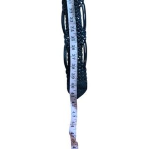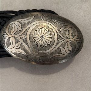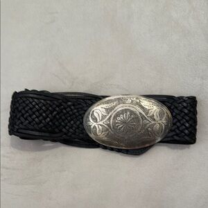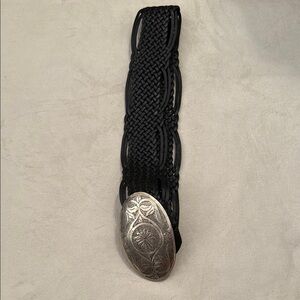 Stylish black braided belt featuring an ornate silver buckle. Perfect for adding a touch of elegance to any outfit.