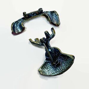 What a fun two piece brooch! This is a vintage rotary phone brooch. I love how it is two pieces so that you can put it on in several ways! The finish on this is so pretty. It is done in an iridescent oil slick color. This is a nice quality piece with a good weight to it. The dial tone has little rhinestones and a round glass center. Great piece to add to your collection!