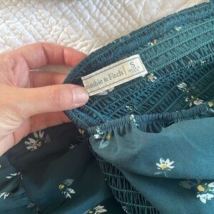 Sweetheart neckline, green with floral patterns. Fitted on top with flowing bottom. Very Feminine, can be worn multiple seasons of the year