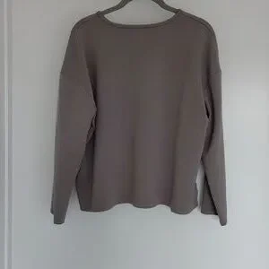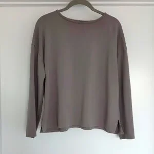 Long sleeve top in a taupe color. Made of a blend of pencil, nylon and elastaine. Style is boxy. It measures 22 inches long, 22-1/2 inches from armpit to armpit. Sleeves end 25 inches from neck opening, with slightly dropped sleeves line.