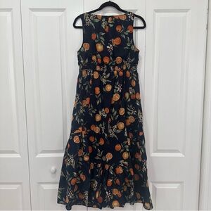 Fully lined, 100% cotton sleeveless maxi dress from Loft with a stretchy waist and adjustable neckline. Sort of has the milkmaid vibe. Orange branches with fruit, leaves, and blossoms on a navy blue background.