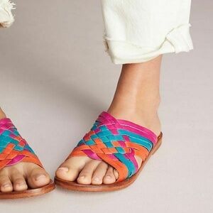 Fabulous Handmade by Beek by Two Birds Orange, blue, and pink woven leather slide sandals, classic Swallow style.