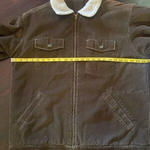 Stay warm and stylish with this brown Patagonia sherpa-lined jacket. Perfect for chilly days, this coat offers comfort and a classic look. I bought this at a wardrobe sale for film and tv . The coat has no identifiable tags . The buttons are Patagonia . This is typical for clothing used for film and tv to cut tags out . Need to measure guessing an extra large pit to pit 24 1/2