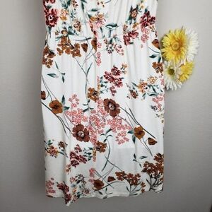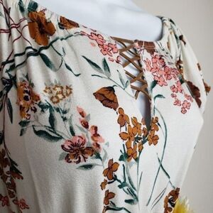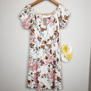 This is a NEW WITH TAG PARC & LEX Lace Up Off Shoulder Floral Mini dress Cream with burnt orange, pink, maroon & green floral print allover. Off Shoulder neckline with elasticized top hem for the perfect fit. Slightly puffed sleeves with elasticized sleeve hems. Lace up style center bust in tan faux suede. Elasticized waist for the perfect fit.