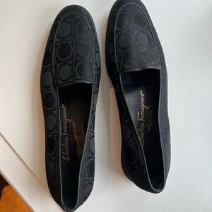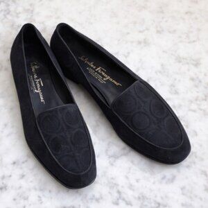 Refined, understated, and unmistakably Italian. These Salvatore Ferragamo black flats are a sophisticated everyday staple with the quality craftsmanship the brand is known for. Featuring a subtle all-over tonal logo pattern and sleek almond-shaped toe, they offer a polished look without being flashy. The low-profile silhouette makes them ideal for work, travel, or elevated casual wear. Details: Brand: Salvatore Ferragamo Size: 9B (standard width) Colour: Black with tonal signature pattern Leather-lined interior Made in Italy Excellent condition Ferragamo flats retail for several hundred dollars new. This is a strong value for a timeless designer shoe that pairs effortlessly with tailored trousers, dresses, or denim.