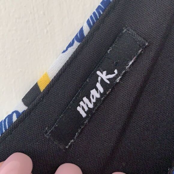 Mark romper with zipper back closure. Pattern is white with black, blue, and yellow. No size tag, but fits like a large. Smoke free, pet friendly home.