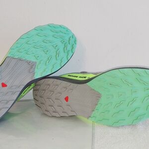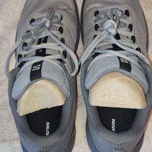 Experience ultimate comfort and performance with the Salomon Men's Sense Ride 5 Trail Running Shoes. Designed in a sleek gray with vibrant yellow accents, these shoes offer excellent grip and support for all your trail adventures. Barely used. Nice medium weight trail sneakers. Like new- Accepting offers