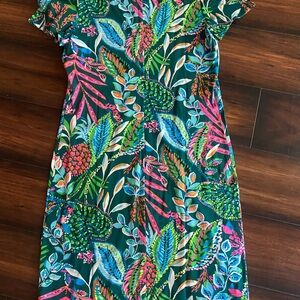 Colorful floral dress with short sleeves. Features a mix of bright colors