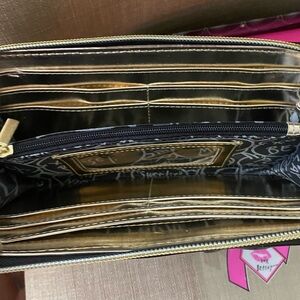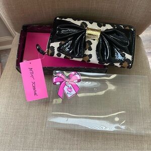 Stylish women's clutch featuring a bold leopard print and a striking black bow. Perfect for adding a touch of elegance to any outfit. Brand new in box with tags. Many pockets for cards or cash. Size is 5” H x 1” D x 9” W. From pet free, smoke free home.