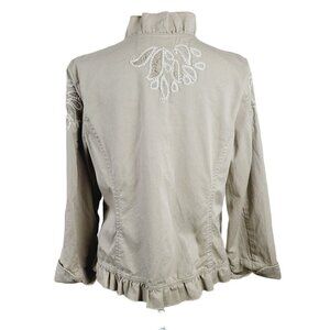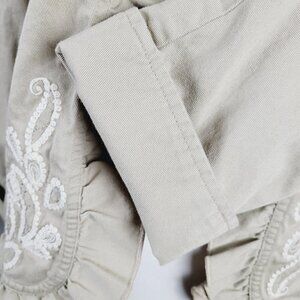 Chico's Sz 1 (Med 8) Jacket Open Front Embroidered Paisley Ruffled Trim Tan