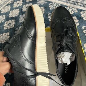 Step into sophistication with Cole Haan's black Oxfords, crafted from smooth leather and adorned with a traditional brogue pattern. These shoes offer a polished, professional look with their sleek silhouette and rounded toe cap, making them ideal for formal occasions.