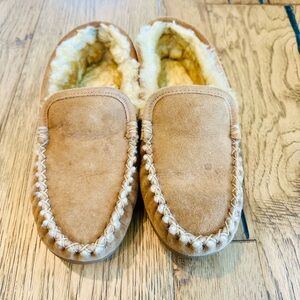 Purchased brand new, wore around the house twice. They have a small water spot on the top of the left foot. Could easily be washed off with a damp cloth. No rips, tears or other stains. Never worn outside.