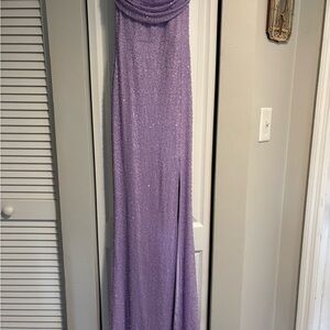 Stunning purple/lavender gown with strapless neckline and side slit. Great for formal events!
