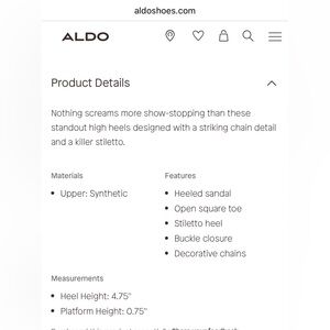 NWOT Aldo Scarlett Chain Stiletto heels. Size 8.5. I bought these and was never brave enough to actually wear them. I’ve tried them on in the house only so the bottom has some marking but the heel tips are brand new as they’ve never been worn out of the house. I can’t wear heels like this anymore but they’re super cute so maybe someone else can enjoy them.