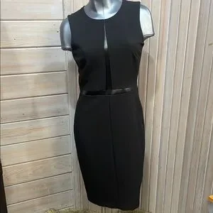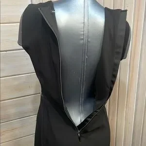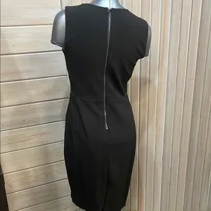 This elegant black sheath dress from White House Black Market is designed with a sleeveless cut and a crew neckline, making it ideal for work or cocktail events. The midi length and subtle slit detail enhance its sophisticated appeal, while the structured fabric ensures a flattering silhouette.