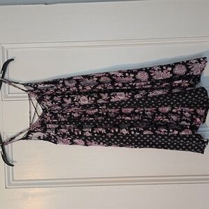 Chic black dress with pink floral pattern. Features spaghetti straps for a stylish look.