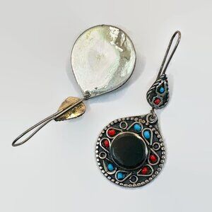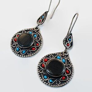 These pierced earrings give a big boho impact! They are vintage Middle Eastern Afghan earrings. These bohemian beauties consists of a silver colored metal. The ear drop dangle is done with a black agate in the center. Both the ear wire and the dangle is set with blue and red glass beads for an additional splash of color. They hang from ear wires to swing and sway. Ornate metal accented them. Fabulous!