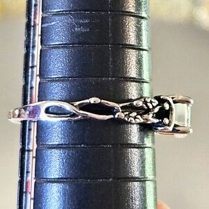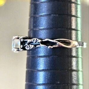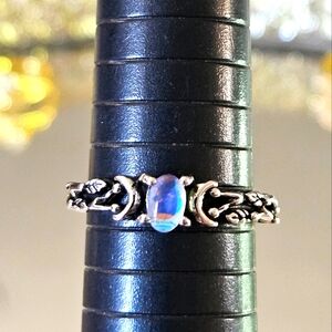 This elegant silver ring features a captivating moonstone, perfect for adding a touch of sophistication to any outfit. The intricate design highlights the beauty of the silver and moonstone combination. The moonstone in this ring is man made.