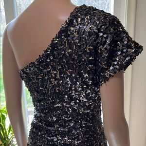 Elegant black and gold sequin one shoulder mini dress. Fully lined. In excellent condition. Cannot make out the manufacturer tag. Size tag is medium. Great evening, event dress.
