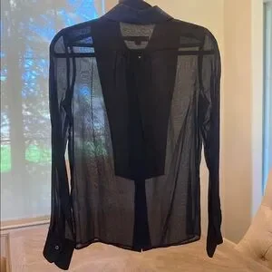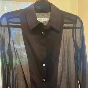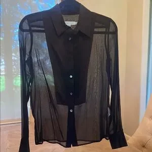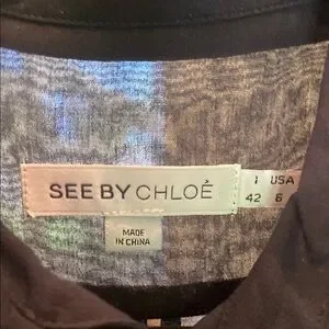 This elegant top from See By Chloe features a sheer navy fabric with a collar and long sleeves. Its lightweight and translucent design makes it perfect for layering, adding a touch of sophistication to any outfit.