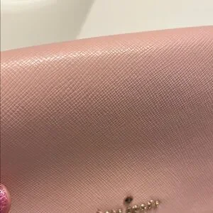 This elegant Kate Spade crossbody bag in a soft pink hue features a structured design and a signature flap closure. The adjustable brown leather strap adds a touch of contrast, making it perfect for versatile day-to-night wear. Very small blue mark as pictured. Barely noticeable.