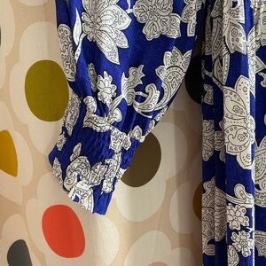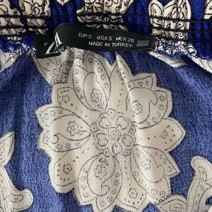 Zara long sleeve maxi dress with a blue and white floral print. Elastic cuffs, unlined, pull on style, no pockets. Deep v neck with ruffle detail along collar. Excellent condition. Size Small.