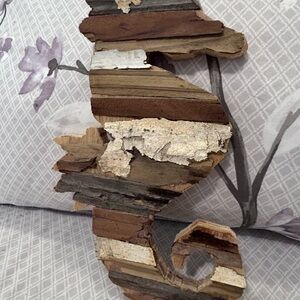 Enhance your space with this charming rustic seahorse wall art. Featuring a blend of natural wood tones, it adds a touch of coastal elegance to any room.