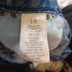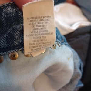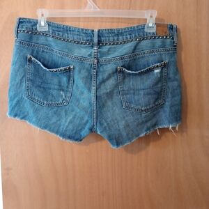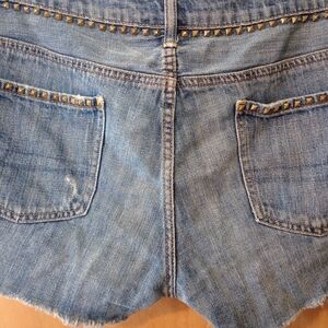 Stylish blue denim shorts with brass colored rivet accents. Frayed hem for a trendy look. Super cute and very short. Buttons all the way up. No holes or stains